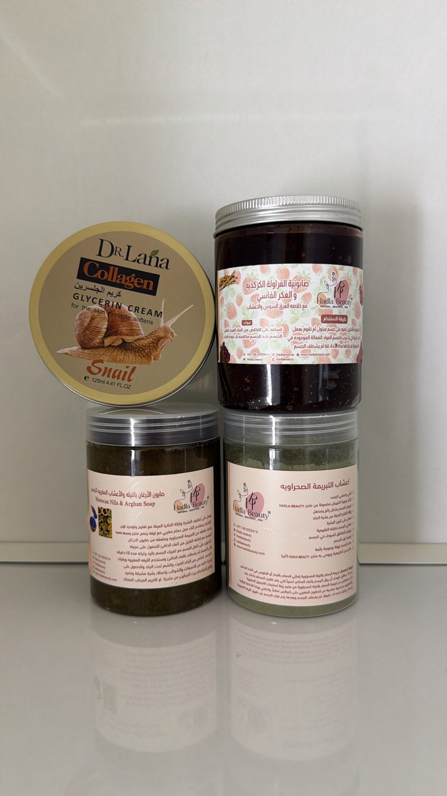 صابونية الكركديه والعكر الفاسي 400 مل و صابون الأرغان بالأعشاب المغربية للجسم و أعشاب التبريمة الصحراوية الأصلية .